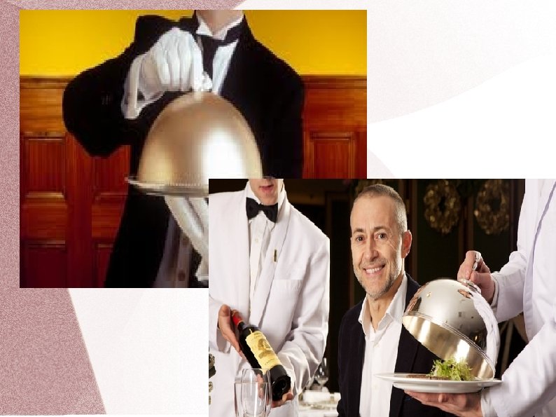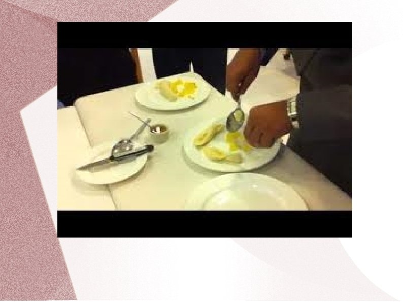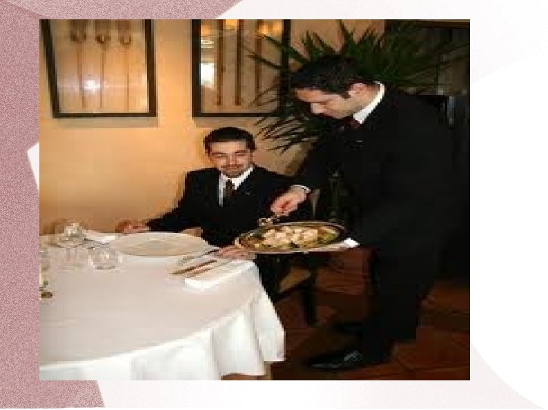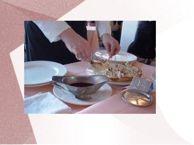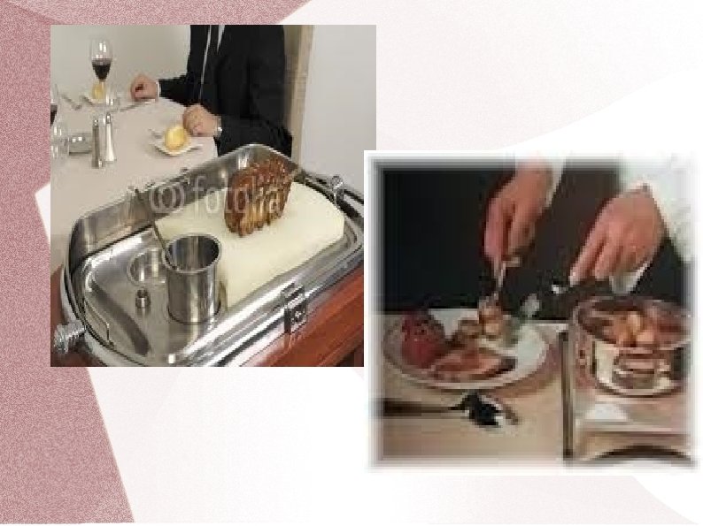 Franču apkalpošanas metode Ēdienu porcionēšana viesiem šķīvī ir augsts apkalpošanas līmenis. Ja jāpasniedz karstie ēdieni, tad šķīvjus uzsilda līdz 40˚C temperatūrai. Pēc tam rīkojas šādi: � Vispirms viesmīlis ēdienu koplietošanas traukos atnes un parāda viesim kopumā; � Tad ēdienu novieto uz servanta; � Ja nepieciešams, sadala porcijās vai šķēlēs; � Sagatavo koplietošanas galda piederumus ēdiena porcionēšanai; � Pieliek galda piederumus pie ēdiena, lai tie būtu pa labi no ēdiena; � Uzliek uz kreisās rokas izvērstas plaukstas četrkārtīgi salocītu salveti; � Uz tās novieto ēdienu koplietošanas traukā, lai justu stabilitāti; � Pieiet pie viesa no kreisās puses; � Mazliet pagriež labo plecu pa labi tā, lai neskartu viesa plecu; � Pasper pussolīti ar labo kāju atpakaļ; � Kreiso roku ar ēdienu šķīvi virza nelielā slīpumā, lai tā maliņa būtu mazliet pāri šķīvja maliņai, lai ēdiena gabaliņi nenokristu uz galda; � Koplietošanas šķīvim ar ēdienu virs viesa šķīvja jāatrodas 5 -6 cm augstāk, lai, porcionējot ēdienu, tas nesadalītos vai neizšļakstītos;