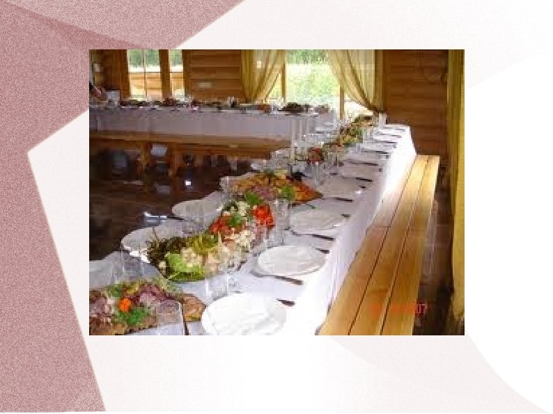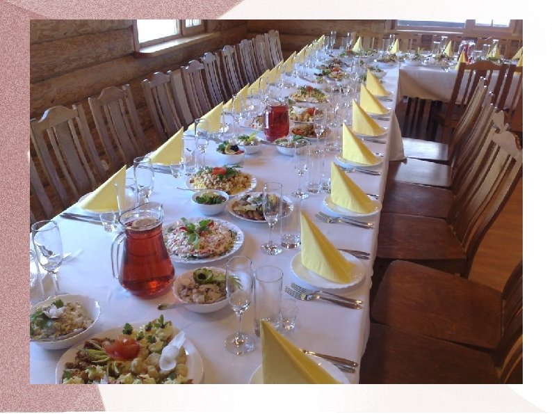 Krievu apkalpošanas metode Ēdienus pasniedz koplietošanas traukos. Šo metodi dēvē par metodi krievu gaumē, jo viesi apkalpo paši sevi. Tas notiek šādi: � Galds iepriekš klāts ar individuāliem traukiem un galda piederumiem katram viesim, ņemot vērā viņa pasūtījumu; � Viesmīlis saņem ēdienus koplietošanas traukos; � Atnes tos un noliek uz servanta; � Pieliek klāt koplietošanas galda piederumus, ar ko paņemt ēdienu; � Ar labo roku novieto ēdienu uz galda pa vidu tā, lai koplietošanas galda piederumi būtu pa labi no viesa; � Viesis apkalpo pats sevi un piedāvā blakussēdētājam, uzliekot ēdienu no koplietošanas šķīvja ar koplietošanas galda piederumiem uz individuālā šķīvja; � Ja vienlaikus jāizvieto vairāki ēdieni, tos sakārto, ievērojot trauku lielumu un