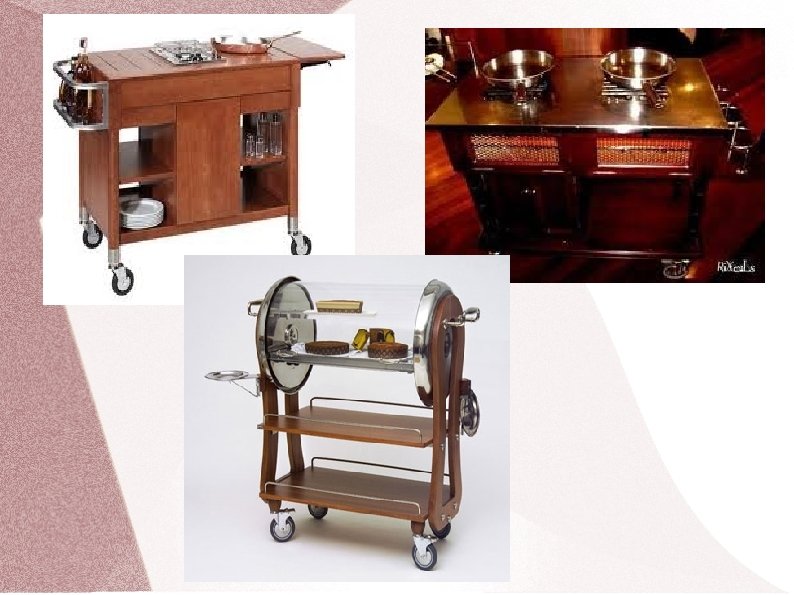Viesu apkalpošanā bieži vien lieto šīs metodes paveidu ar servējamo ratiņu palīdzību. Tas notiek šādi: � Sagatavo pārvietojamos servējamos ratiņus; � Ēdienus koplietošanas traukos novieto uz servējamiem ratiņiem; � Sagatavo galda piederumus ēdiena pārlikšanai; Sagatavo individuālos šķīvjus; � Karsto ēdienu pasniegšanai šķīvji sasildīti līdz 40�temperatūrai; � Piebrauc pie katra galdiņa; � Sagatavo ēdiena porciju; � Pasniedz katram viesim no labās puses un noliek tieši priekšā; � Karsto ēdienu pasniedz, satverot sasildīto šķīvi ar salvetes palīdzību. Servējamos ratiņus var lietot arī netīro trauku novākšanai. To dara šādi: � Ar servējamiem ratiņiem piebrauc pie katra galdiņa; � Katram viesim no labās puses ar labo roku paņem netīro šķīvi kopā ar galda piederumiem; � Novieto to uz servējamiem ratiņiem; � Sakārto tāpat kā uz paplātes, tas ir, atsevišķi šķīvjus; � Atsevišķi galda piederumus un ēdienu atliekas; � Individuālos maizes šķīvīšus pirms deserta pasniegšanas novāc ar labo roku viesim no kreisās puses.