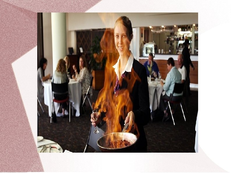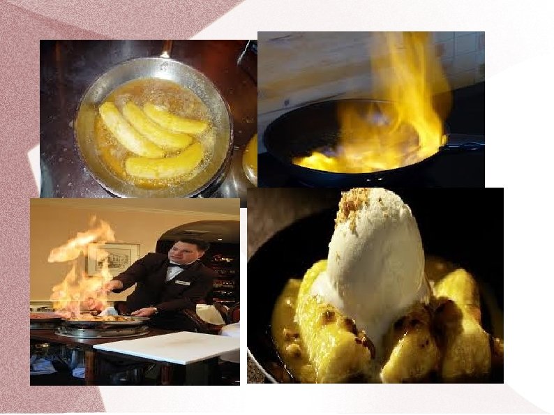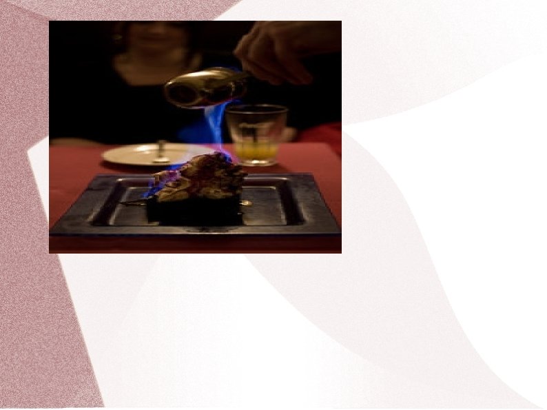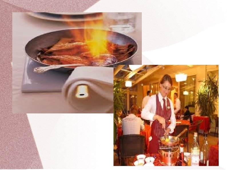Ēdienu pagatavošana viesu klātbūtnē – flambēšana Izmanto augstas klases, ekskluzīvos restorānos Profesionāls viesmīlis-pavārs demonstrē orģinālus darba paņēmienus ''liesmojoša'' ēdiena pagatavošana