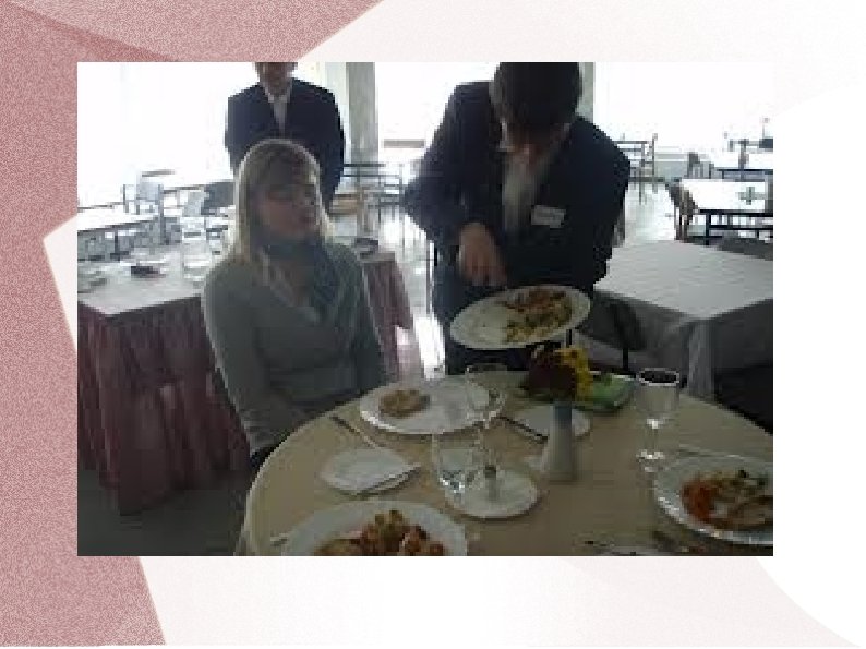 salātus novieto apkārt pamatēdienam; » Pārliekot ēdienu uz viesa šķīvja, to dara ar dakšu un karoti, strādājot ar abām rokām; » Sakārtojot ēdienu uz viesa šķīvja, tas jādara glīti, gaumīgi un ar precīzām kustībām; tas prasa zināmas profesionālas iemaņas; » Gatavo ēdiena porciju pasniedz ar labo roku; » No labās puses novieto viesim tieši priekšā; » Novēl „labu apetīti!”