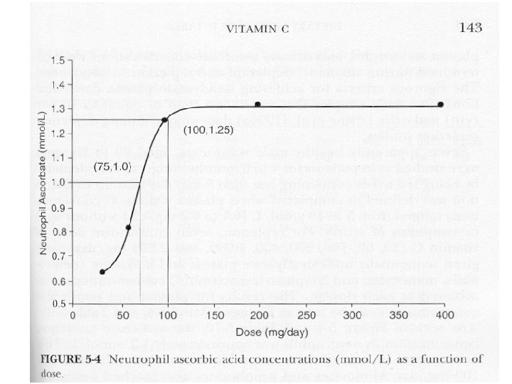 EAR and RDA for Vitamin C • EAR = 75 mg for adult men 60 mg for women • Based on following study: – 7 healthy men lived in for 6 months – Fed low C diet (5 mg/d) until depleted – Given graded doses until steady state reached – Measured serum, neutrophil, and urine ascorbate