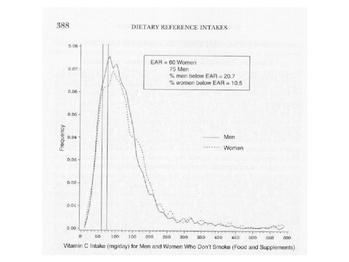 How do we assess Vitamin C adequacy? • Find usual intake of vitamin C in population • The percent of the pop’n whose intakes are below EAR = % at risk for inadequacy • In following figure, North Americans have some risk of inadequacy: – ~ 10 -20% ingesting too little