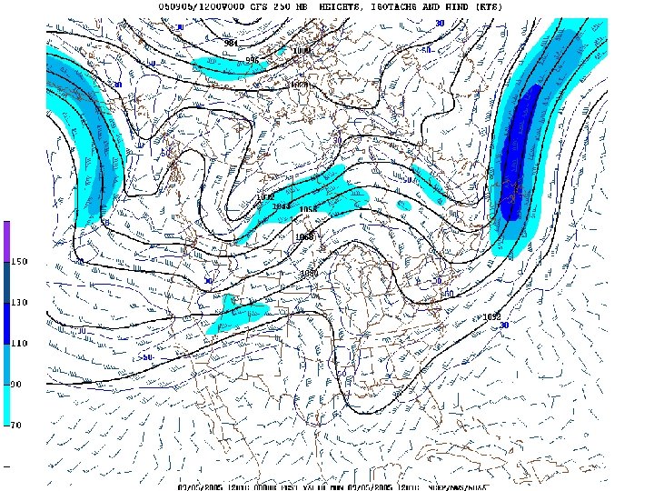 200/250 mb Analysis • Isotachs (light dashed contours) – 20 knot intervals with a 10 knot reference line – Stippled regions represent: • 70 -110 knot winds • 150 -190 knot winds