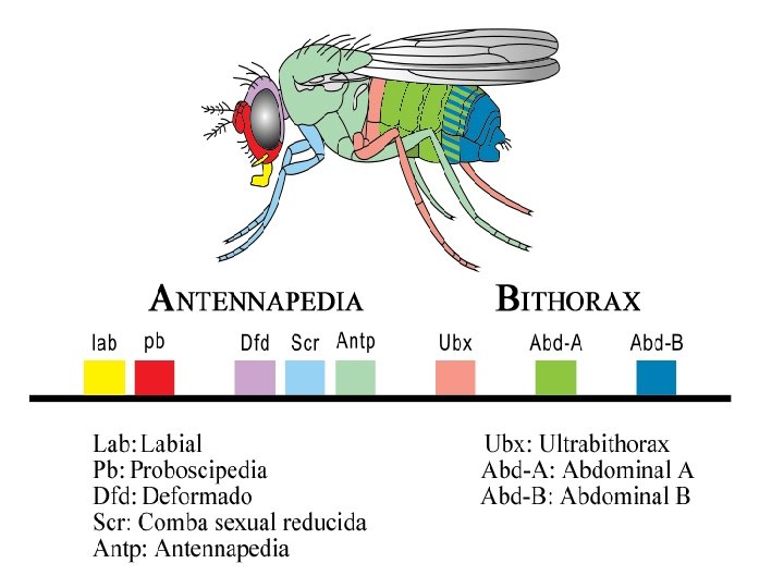 • Las anomalías que se muestras en las drosófilas mutantes afectan sólo a los genes que determinan la localización de las alas (mutante bitorax) y las patas (mutantes Antennapedia). Estos genes se llaman genes homeóticos y sus mutaciones son mutaciones homeóticas.