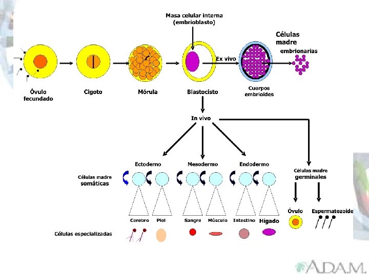 Las células troncales En adultos En embriones Dan origen a todos los tipos celulares Participan en la mantención de tejidos en renovación Piel o tubo digestivo Reparación de tejidos