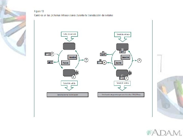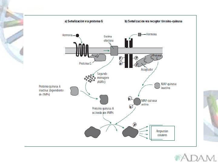 Transducción de señales 1. - Formación complejo Hormona. Receptor: esto lleva a un cambio conformacional en el receptor. 2. - Activación proteína transductora: el cambio conformacional, activa una proteína transductora, que es generalmente una proteína G. 3. - Activación segundo mensajero: La proteína G activa al segundo mensajero, el cual generalmente es AMPc (AMP cíclico) el cual desencadena una serie de reacciones metabólicas, que llevan al cambio en la actividad de la célula.