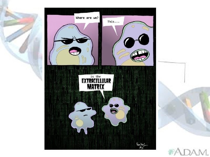 La matriz está compuesta por polisacáridos y proteínas muy diversos, secretados y ensamblados localmente formando una compleja red que se encuentra en íntima asociación con la superficie de la célula que la produce. • • • Las funciones de la matriz extracelular son: Entrada de nutrientes Salida de desechos Resistencia a los tejidos Mantener su estructura