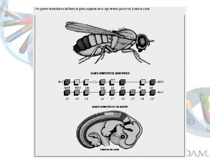 GENES HOMEOTICOS Los genes homeóticos definen el plan corporal en el eje antero-posterior (cabeza-cola)