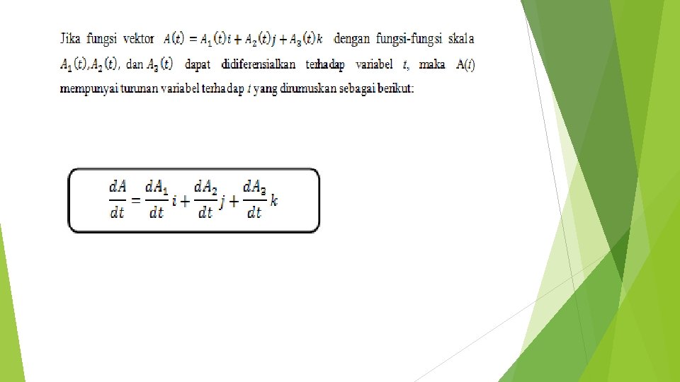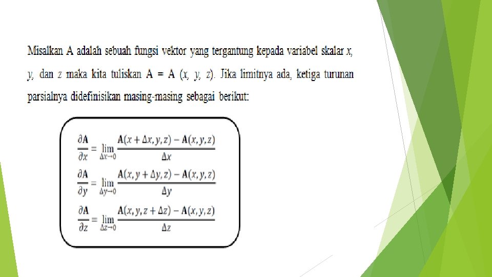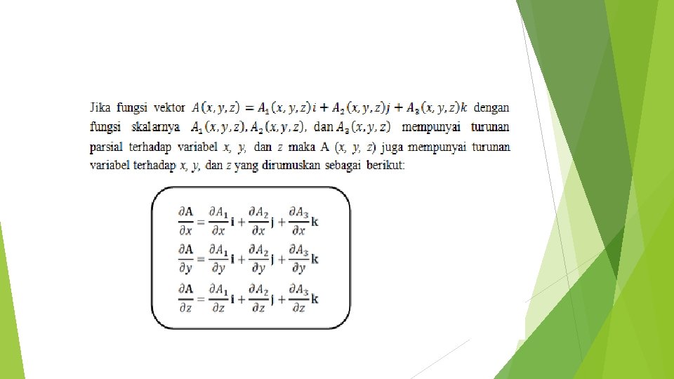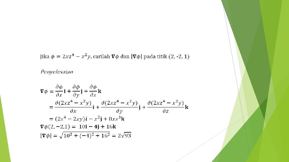 Gradien Misalkan terdefinisi dan diferensiabel pada setiap titik (x, y, z) dalam ruang , maka gradien atau grad atau didefinisikan oleh :