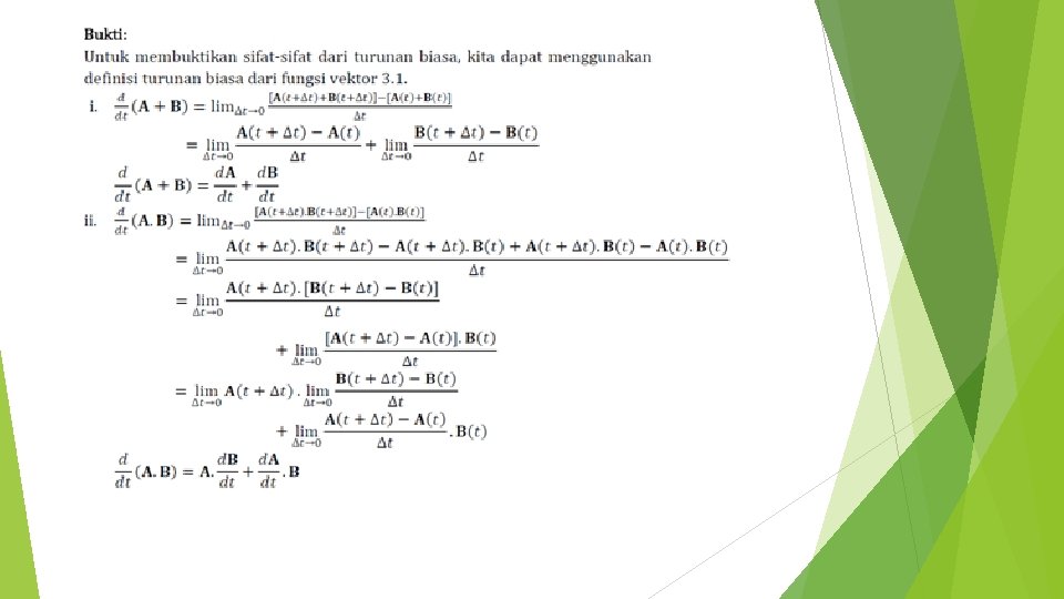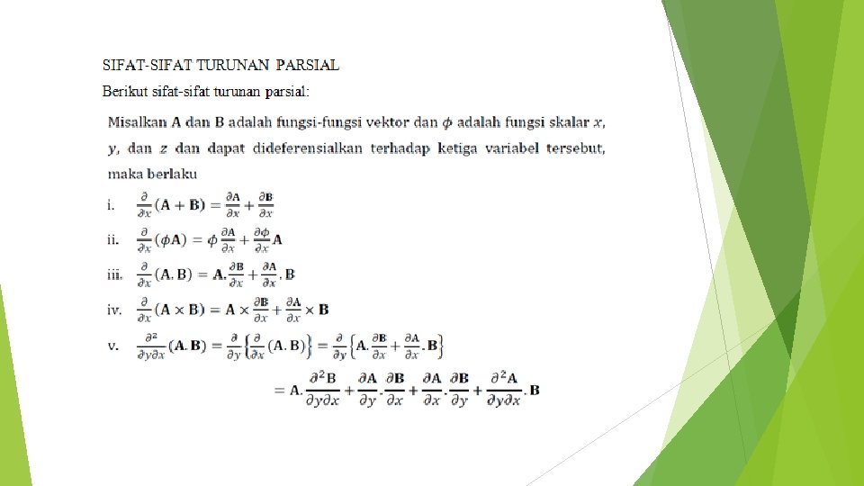 TURUNAN PARSIAL Turunan parsial untuk fungsi vektor dua variabel atau lebih, prinsipnya sama dengan definisi turunan fungsi vektor satu variabel, dimana semua variabel dianggap konstan, kecuali satu yaitu variabel terhadap apa fungsi vektor itu diturunkan.