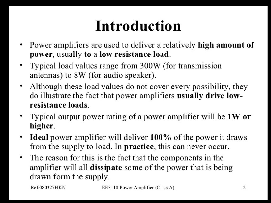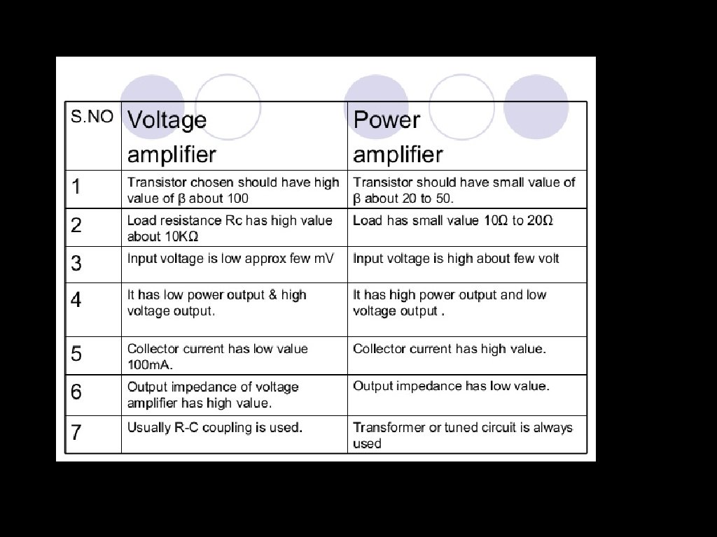 Difference Between Voltage Amplifier and Power Amplifier A voltage amplifier is designed to achieve maximum voltage amplification. However, it is not important to raise the power level. On the other hand, a power amplifier is designed to obtain maximum output power. Voltage Amplifiers The voltage gain of an amplifier is given by : In order to achieve high voltage amplification, the following points should be noted : 1. The transistor with high β, more than 100 is used in the circuit. In other words transistors with thin base are used in this case. 2. The input resistance of the transistor should be low as compared to the collector load resistance. 3. A relatively high load resistance is used in the collector. To permit this condition, voltage amplifiers are always operated with at low collector currents nearly 1 m. A. Power Amplifiers A power amplifier is needed to deliver a large amount of power and hence it has to handle a large amount of current. In order to achieve high power amplification, the following points should be noted : 1. The size of the power transistor is made considerably larger in order to dissipate the heat generated in the transistor during operation. 2. The base is made thicker to handle large current. In other words transistors with smaller β (normally between 5 to 20) are used in this case. 3. Transformer coupling is used for impedance matching.