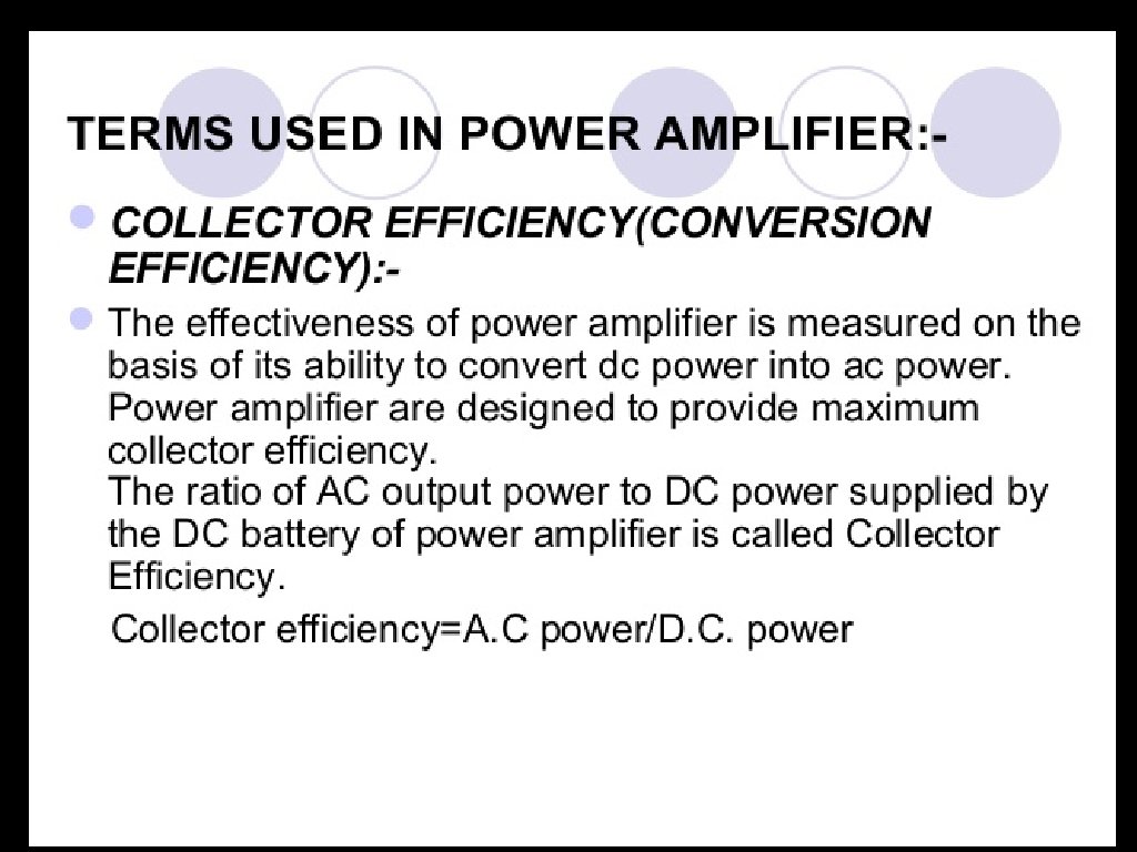 Important terms about power amplifier 1. Collector Efficiency - The ration of A. C. output at zero signal power to average D. C. power input to transistor. collector efficiency = average a. c. power output average d. c. power input 2. Distortion - When the output of an amplifier is not similar to the input signal we say distortion is there. This is due to non-linear characteristic of transistor. Types of distortion - a. Harmonic Distortion b. Phase distortion c. Frequency distortion 3. Power dissipation capacity Is defined as the ability of a transistor to dissipate the heat developed in it. 5