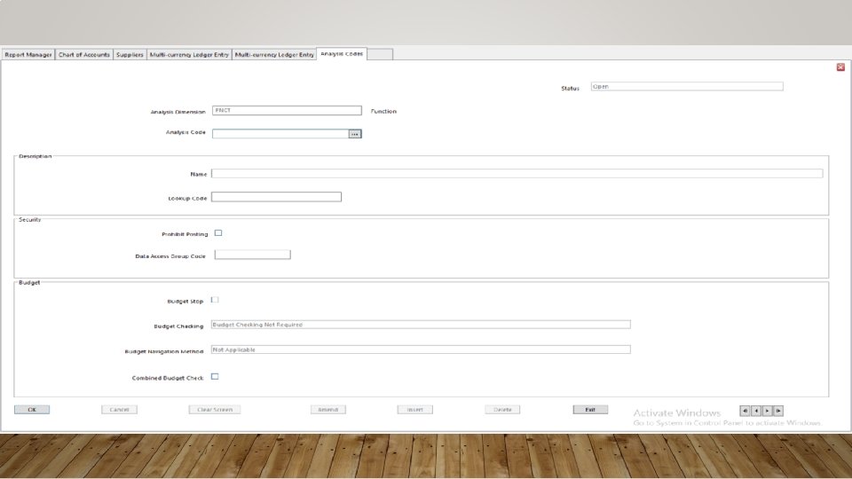 LEDGER ANALYSIS 1 • In Sun. Systems 6. 2, Ledger Analysis 1 is the Resource Dimension (RSCE) • Resource allows the organization to track the various allocations of assets • The Allocated Functions that you are used to finding in Ledger Analysis 4 – Function, are now Resource Analysis Codes • This reassignment makes it easy to track both Allocation and Function • Instead of picking either an Allocation or a Department Function, you can tag a transaction with both the Allocation AND the Function • The Resource Analysis Codes are displayed for your information on the next slide