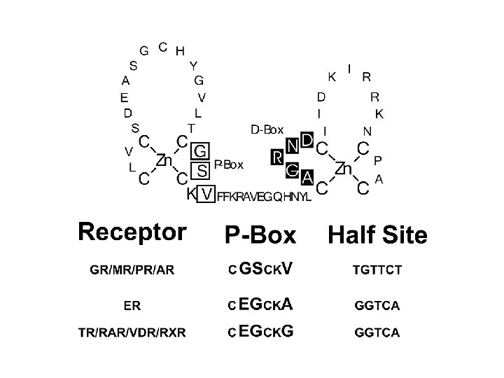 The DNA binding domains of the NHR contain two Zinc fingers. The first (more N-terminal) binds DNA The second provides a dimerization interface (probably DNA dependent) Small primary sequence determinants in the “P-Box” confer specificity of DNA binding