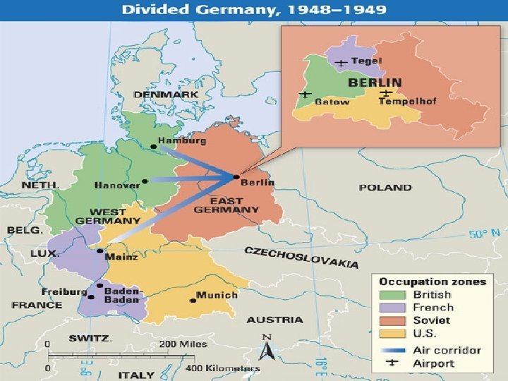 3. The Berlin Airlift*: 1948 a. USSR closed all land routes to Berlin hoping to make allies leave b. West dropped food/supplies using airdrops for over a year=USSR gave up & ended the blockade c. =Berlin divided between West (democratic) & East (communist) d. USSR built the Berlin Wall in 1961 Taken down in 1989