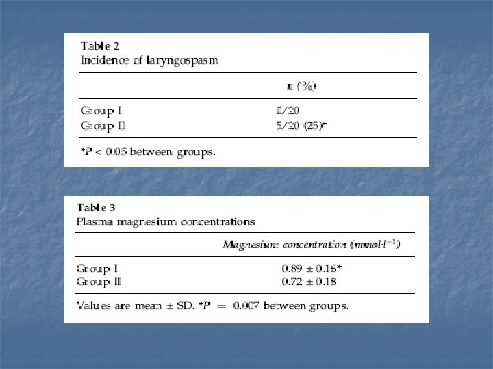 n n n Two minutes after intubation, in group I, patients received an infusion of magnesium sulphate 15 mg/kg in 30 ml 0. 9% Na. Cl for 20 min. In group II, patients received only the same amount of 0. 9% Na. Cl. Five minutes before extubation, blood samples from children were collected to assess plasma magnesium concentrations.