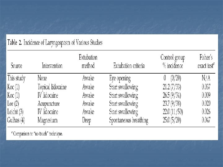 Background n Many of studies in these fields have focused on pharmacological or invasive interventions, such as topical lidocaine, IV lidocaine, acupuncture, or IV magnesium to prevent laryngospasm, whereas little attention has been placed on the importance of extubation technique.
