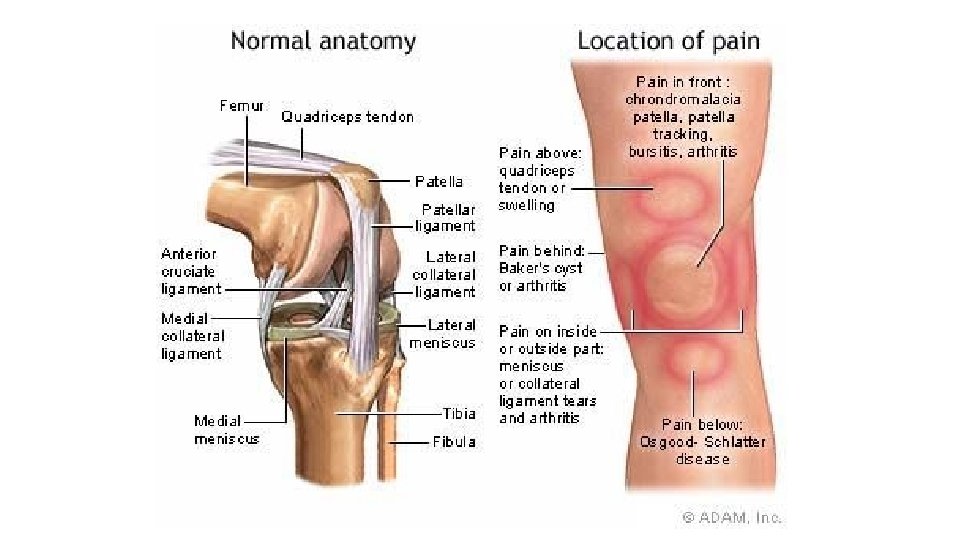 Differential Diagnosis • The differential diagnosis of knee pain is extensive but can be narrowed with a detailed history, a focused physical examination and, when indicated, the selective use of appropriate imaging and laboratory studies. • Calmbach WL & Hutchens M. Evaluation of Patients Presenting with Knee Pain: Part I. History, Physical Examination, Radiographs, and Laboratory Tests. Am Fam Physician. 2003 Sep 1; 68 (5): 907 -912.