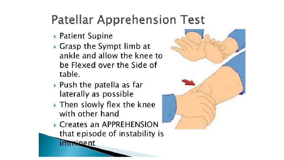 Lateral Pivot Shift Test for IDK • A positive test may result in a gentle slide (Grade 1), or in a more severe jerk (Grade 2), or clunk (Grade 3). • The grade of the pivot shift has been shown to correlate with patient-reported functional instability and clinical outcomes. • https: //www. youtube. com/watc h? v=cy 20 e. A 9 q. Tl. M