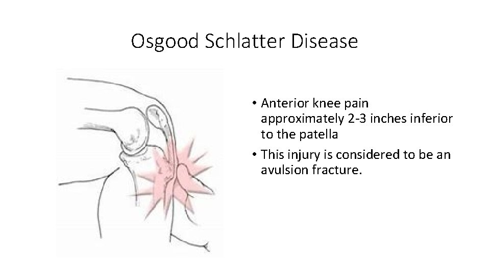 Osgood Schlatter Disease • Anterior knee pain approximately 2 -3 inches inferior to the patella • This injury is considered to be an avulsion fracture.