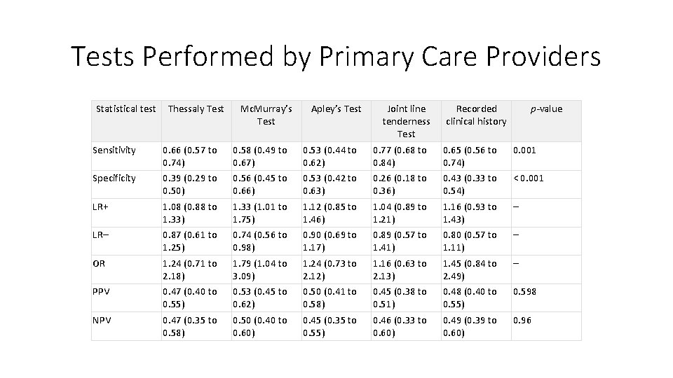 Tests Performed by Primary Care Providers Statistical test Thessaly Test Mc. Murray’s Test Apley’s Test Joint line tenderness Test Recorded clinical history p-value Sensitivity 0. 66 (0. 57 to 0. 74) 0. 58 (0. 49 to 0. 67) 0. 53 (0. 44 to 0. 62) 0. 77 (0. 68 to 0. 84) 0. 65 (0. 56 to 0. 74) 0. 001 Specificity 0. 39 (0. 29 to 0. 50) 0. 56 (0. 45 to 0. 66) 0. 53 (0. 42 to 0. 63) 0. 26 (0. 18 to 0. 36) 0. 43 (0. 33 to 0. 54) < 0. 001 LR+ 1. 08 (0. 88 to 1. 33) 1. 33 (1. 01 to 1. 75) 1. 12 (0. 85 to 1. 46) 1. 04 (0. 89 to 1. 21) 1. 16 (0. 93 to 1. 43) – LR– 0. 87 (0. 61 to 1. 25) 0. 74 (0. 56 to 0. 98) 0. 90 (0. 69 to 1. 17) 0. 89 (0. 57 to 1. 41) 0. 80 (0. 57 to 1. 11) – OR 1. 24 (0. 71 to 2. 18) 1. 79 (1. 04 to 3. 09) 1. 24 (0. 73 to 2. 12) 1. 16 (0. 63 to 2. 13) 1. 45 (0. 84 to 2. 49) – PPV 0. 47 (0. 40 to 0. 55) 0. 53 (0. 45 to 0. 62) 0. 50 (0. 41 to 0. 58) 0. 45 (0. 38 to 0. 51) 0. 48 (0. 40 to 0. 55) 0. 598 NPV 0. 47 (0. 35 to 0. 58) 0. 50 (0. 40 to 0. 60) 0. 45 (0. 35 to 0. 55) 0. 46 (0. 33 to 0. 60) 0. 49 (0. 39 to 0. 60) 0. 96