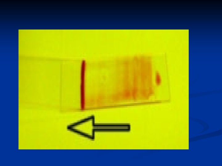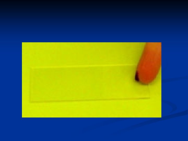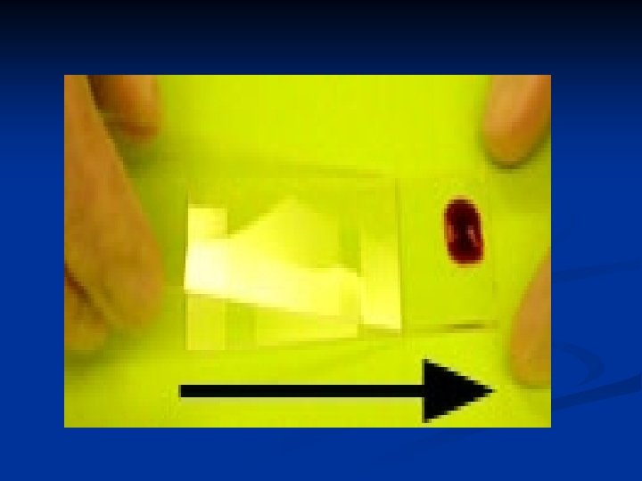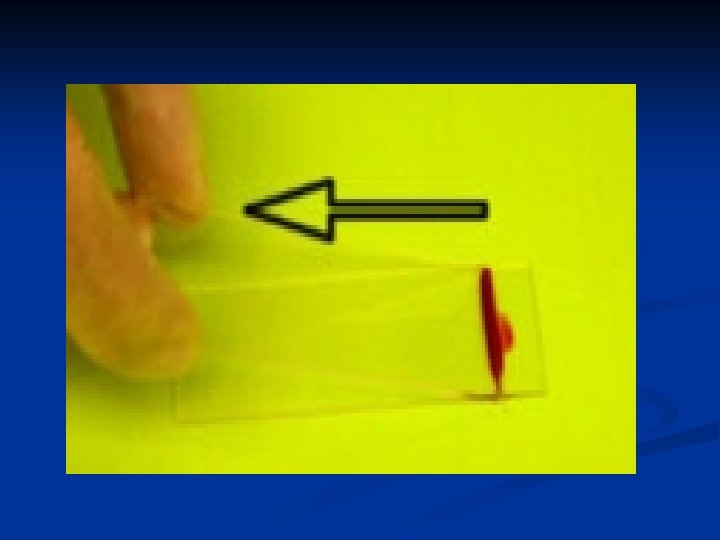 Procedure Prepare the blood smear n Clean two slide, one to be covered with the blood film and one to be used as spreader. n Clean the finger with alcohol, allow it to dry and then prick it with a disposable lancet to obtain a drop of blood. n Make a fine touch of one end of a slide with the drop of blood (only a small amount is required). n Place the edge of the other slide on the surface of the first slide just in front of the drop of blood and at an angle of 45˚.