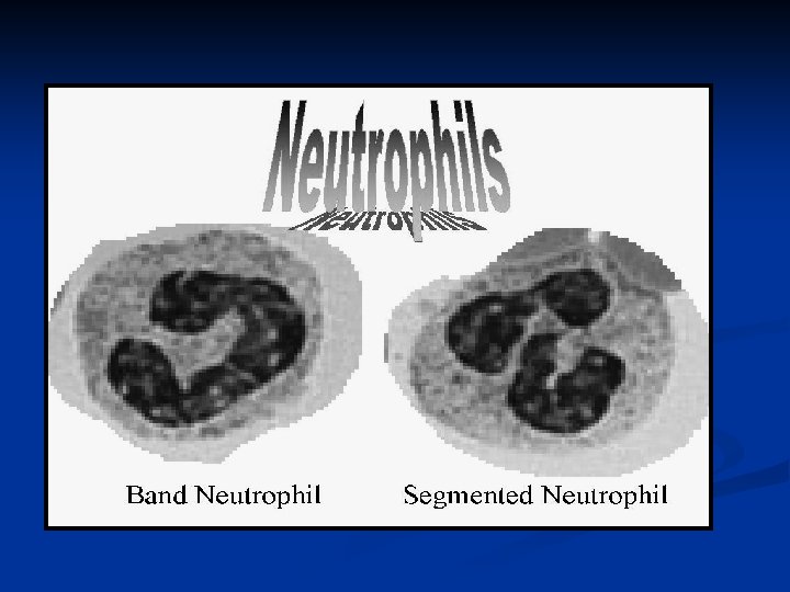 Fast Facts: n Stain with neutral dyes, phagocytic, the most abundant of the leukocytes (62% of WBCs count), often referred to as "band" and "segmented“ n "Neutrophilic leukocytosis" is an increase in neutrophils n "Neutropenia" is a decrease in neutrophils n