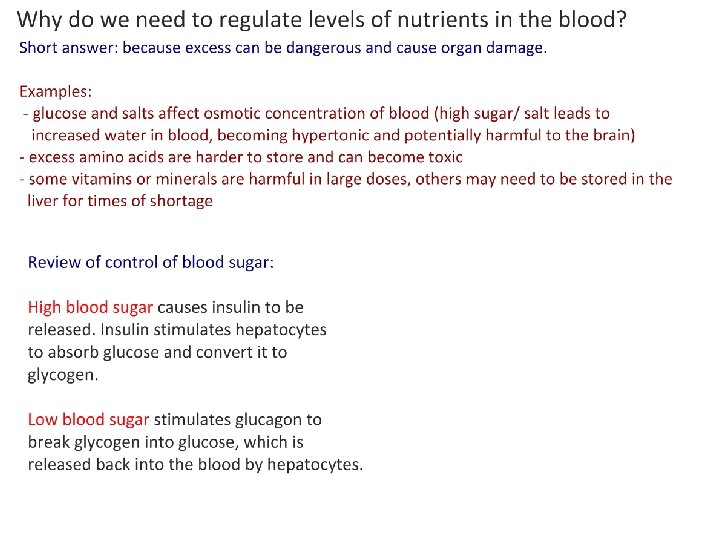 Carbohydrate storage glucose > via insulin > glycogen > via glucogen > glucose • Insulin and glucogen are hormones not enzymes • Blood sugar levels stay constant even after meals • Liver converts monosaccharides into glucose and stores surplus as glycogen • Blood sugar levels wants to stay at 90 mg/100 cm 3 • When blood glucose level falls below 60 mg/100 cm 3; glycogen converted back to glucose Iron storage • Iron in hemoglobin. Hemoglobin found in erthrocytes. • Erthrocytes last 120 days before they break down. Once broken down iron is stored • Stored in liver as ferritin to produce more hemoglobin Vitamin A and D storage • Both are fat soluble • Vit A found in dairy products and carrots. Part of visual pigment • Vit D found in dairy products and cod liver oil, also made by skin in UV. Helps in the uptake of calcium.