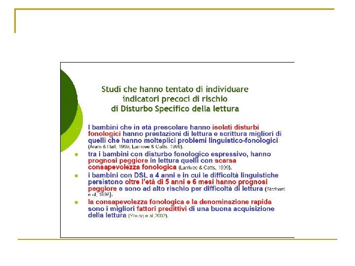 INDICI DI RISCHIO attenzione a: - otiti medie secretive ripetute (ipoacusia e conseguente difficoltà nella discriminazione uditiva di alcuni suoni) n disturbo di linguaggio persistente recettivo e/o espressivo anche all’ultimo anno di scuola materna (aree da osservare per l’org. formale: FONOLOGIA (E MORFOSINTASSI) ma anche aspetti LESSICALI/SEMANTICI, PRAGMATICI, COMUNICATIVO/CONVERSAZIONALI n