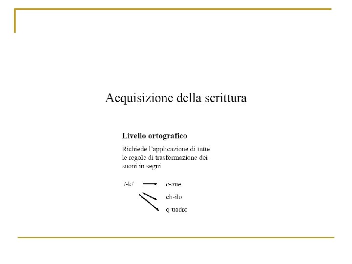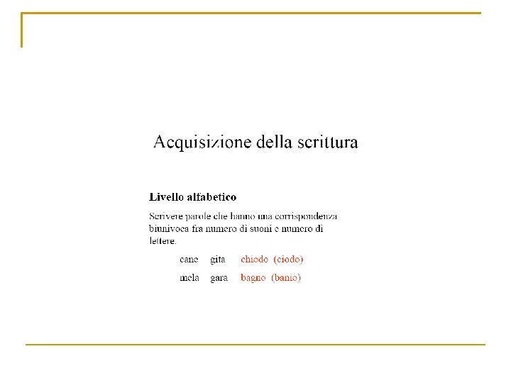 L’ACQUISIZIONE DELLA LINGUA SCRITTA n n Fase di prescrittura (scrittura non alfabetica o presillabica, dove cioè non sono presenti indizi dell’adozione di un criterio di analisi fonologico del ling. ) 1) dal disegno all’insieme di segni grafici astratti (imitazione dell’adulto-che-scrive) 2) maggiore attenzione ai caratteri formali della scrittura (si preoccupa che sia formalmente corretto, ma non c’è ancora “innesto fonologico). Presenza di hp costruttiva (la scrittura mantiene alcune delle proprietà che l’oggetto possiede vedi casa -casina) 3) evoluzione e completamento dell’elab. dei caratteri formali della scrittura; presenza di differenziazione intra ed interfigurale (diverse lettere all’interno della stessa “parola” e in “parole” diverse)