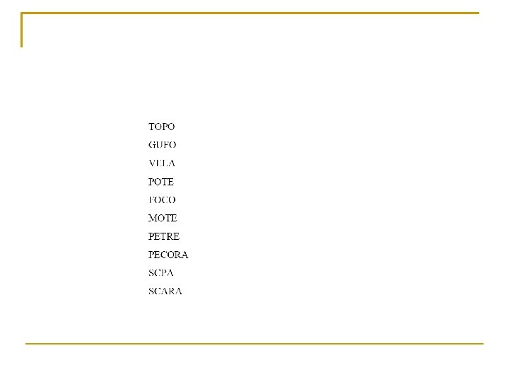 n Si ipotizza una consapevolezza fonologica globale, che attiene alla struttura fonologica superficiale del linguaggio n Capacità di analizzare o manipolare strutture acustiche come le sillabe o le rime percettivamente più salienti e più facilmente pronunciabili e riproducibili dal p. d. v. articolatorio n E’ presente in soggetti che usano sistemi di scrittura non alfabetica, adulti analfabeti, bambini in età prescolare>>>è preparatoria (ma indipendente) all’apprendimento della lingua scritta (vedi sopra) n Riconoscimento e produzione di rime n Riconoscimento di uguale sillaba iniziale in parole diverse n Segmentazione in sillabe