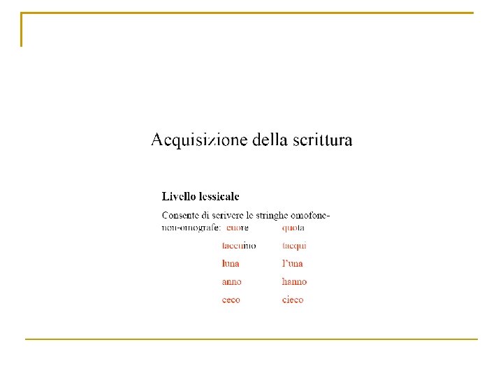 n consapevolezza fonologica analitica (o consapevolezza fonemica)che attiene alla E una struttura segmentale profonda del linguaggio (fusione, segmentazione, delezione lettera iniziale). Non presente in soggetti che usano sistemi di scrittura non alfabetici, e prima dell’apprendimento della lingua scritta. n Diversi studi indicano che questa capacità richiede un’opportunità “culturale” per “slatentizzarsi” e diventare abilità operativa attuale.