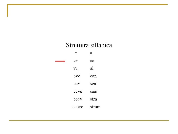 Confronto tra sillabe e fonemi sillaba fonema Segmento acustico sublessicale Struttura fonologica superficiale profonda Dimensione/durata Maggiore, di solito composta da due o più fonemi Minore, unitaria, “indivisibile” Autonomia articolatoria Si (evento percettivo ben definito) No, atto articolatorio incompleto, sospeso Invarianza acustica e percettiva Si (è uguale a se stessa No, l’acustica cambia in in ogni parola in cui base alla combinazione compare) fonemica Posizione nella corrente contigue acustica fusi