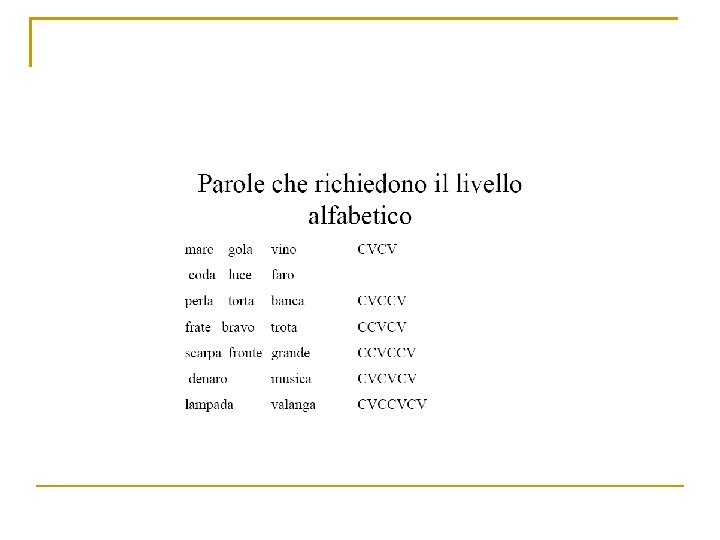 n n Si giunge al livello alfabetico o della decodifica fonologica, attraverso (Martini, 95): - conoscenza del materiale alfabetico, che passa attraverso l’attivazione di una serie di strategie operative di tipo visuo-percettivo (ricognizione dei caratteri formali delle lettere), prassico (capacità di riproduzione delle lettere) e associativo (costruzione di legami convenzionali tra segno e suono)