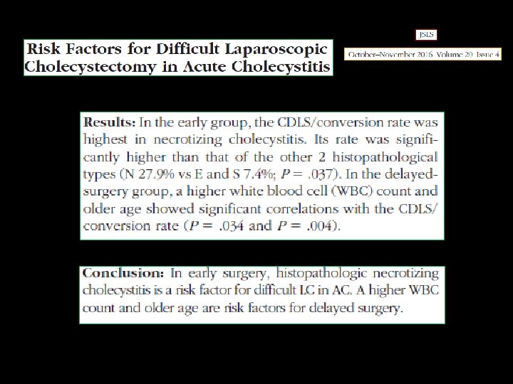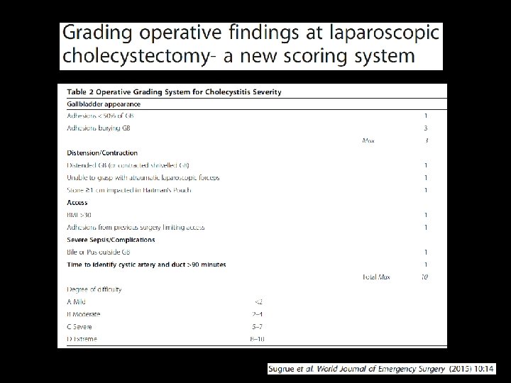 Difficult Cholecystectomy • Procedure with an increased surgical risk compared with standard Cholecystectomy • One taking longer that 90 minutes, tearing the gallbladder, spending more that 20 minutes dissecting the gallbladder adhesions, or more than 20 minutes dissecting Calot’s triangle Lal P ; JSLS 2002
