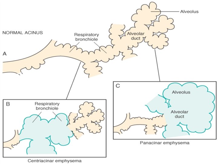 Emphysema Centriacinar Vs Panacinar A, Diagram of normal structures within the acinus, the fundamental unit of the lung. A terminal bronchiole (not shown) is immediately proximal to the respiratory bronchiole. B, Centrilobular emphysema with dilation that initially affects the respiratory bronchioles. C, Panacinar emphysema with initial distention of the peripheral structures (i. e. , the alveolus and alveolar duct); the disease later extends to affect the respiratory bronchioles.