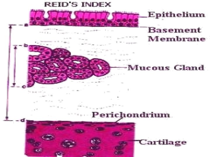 Gross: Airways are hyperemic, swollen & filled with mucopurulent secretion. Microscopically: • Enlarged mucous secreting glands in the trachea & bronchus, this is best estimated by the increase in the Reid Index. • Marked narrowing of the bronchioles due to goblet cell metaplasia, mucous plug, inflammation & fibrosis. • The bronchial epithelium may show squamous metaplasia and dysplasia. Reid index: It is the ratio of the thickness of the mucous gland layer / thickness of the wall between the epithelium and the cartilage. Normally it is 0. 4 , it increases in chronic bronchitis.