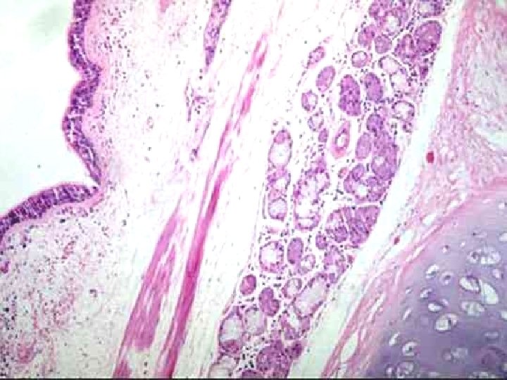 Chronic bronchitis The lumen of the bronchus is above. Note the marked thickening of the mucous gland layer (approximately twice normal) and squamous metaplasia of lung epithelium.