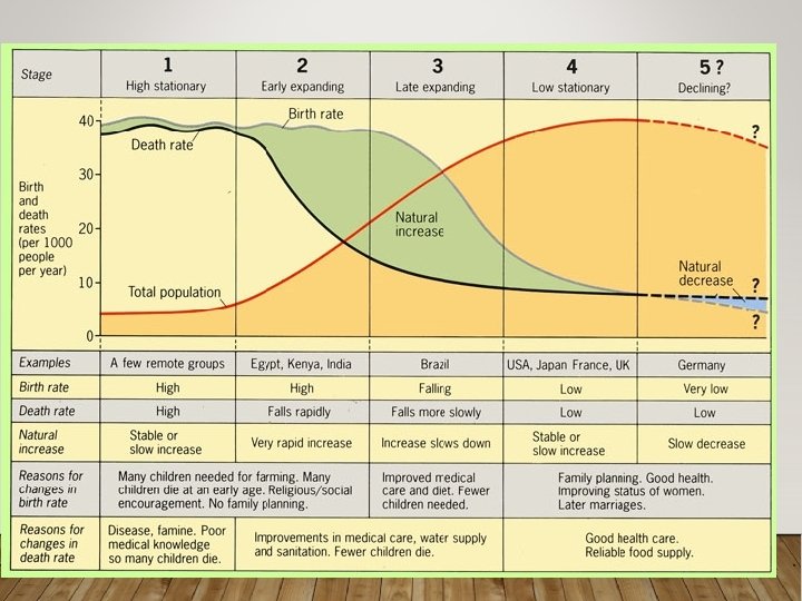 EPIDEMIOLOGICAL TRANSITION STAGE 5 • Death caused by new diseases, and same reasons as Stage 4 • Some infectious diseases have evolved and returned • New diseases have emerged • New strains of viruses & bacteria are drug resistant • Most people can’t afford new drugs • Populations may be shrinking from low birth rates