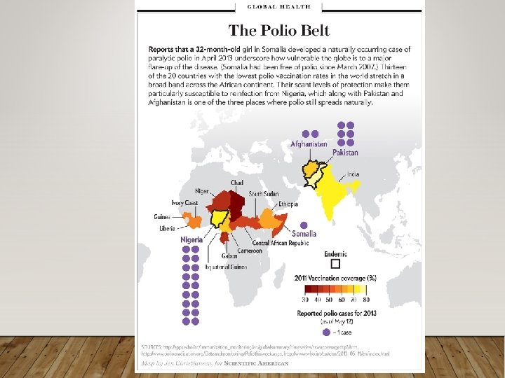 POLIO • An infectious viral disease • Often causes paralysis of the legs • One of the most dreaded childhood diseases of the 20 th century • A vaccine was developed in the 1950 s • There have been recent outbreaks in Syria and Democratic Republic of Congo