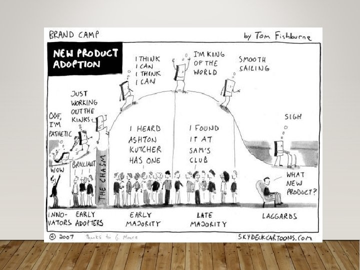 Who is involved with diffusion? * Innovators – risk-takers, educated, have the resources & desire to try new things * Early adopters - social leaders, popular, educated, usually the first one in the group to have the latest gadget * Early majority - deliberate, they like seeing how new technology will fit in their lives * Late majority - skeptical, traditional, lower socio-economic, they react to peer pressure or economic necessity * Laggards – more traditional, fear of debt, may not have the resources to try new things