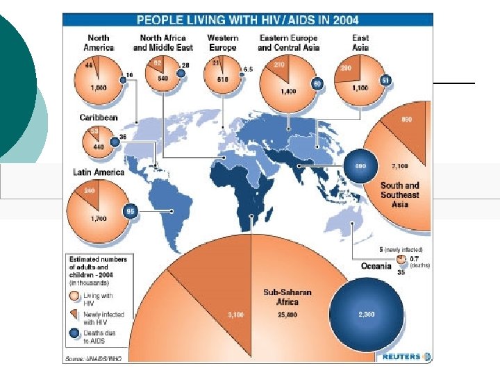 AIDS in the US & Sub-Saharan Africa ¡ In the US l Homosexual males & intravenous drug users were among those most commonly affected l Now, AIDS cuts across all sociological boundaries (age, gender, sexual orientation, race…) ¡ In sub-Saharan Africa l HIV/AIDS primarily affects young women (4 times as high as the rate for men) ¡ l For women, AIDS progresses faster, and they die sooner This greatly alters African society
