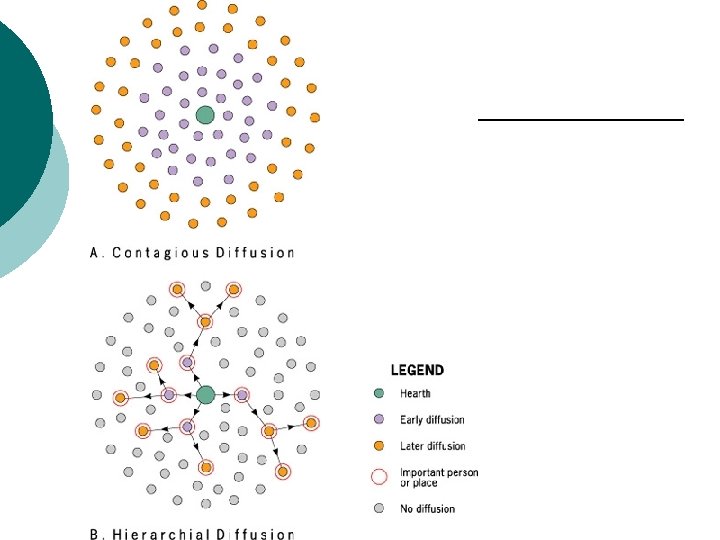 Diffusion: the spread of an idea or innovation from its hearth to other areas. (the process of dissemination) • What slows/prevents diffusion? - time-distance decay - barriers