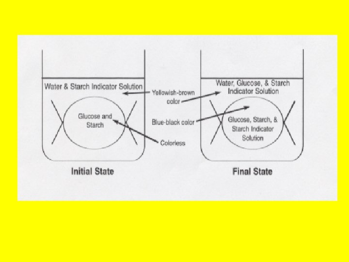 • • The inside of the bag turns blue-black while the outside stays brown, proving that indicator went in, but starch did not leave. Glucose indicator (blue) + glucose (clear) + HEAT = green, brown, red, or orange Testing the fluid outside the ‘cell’ shows glucose has left. This is tested by placing fluid from outside into a test tube, adding indicator solution, and heating the mixture. You may prove that #6 is true by testing (heating) indicator alone and also testing indicator + starch. Both of these controls result in a blue color (no change).