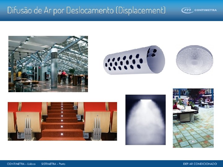 Principais diferenças Em relação ao sistema tradicional por mistura • Difusor colocado a nível do solo. • Menores diferenciais de temperatura (Tins-Tamb) máximo = -6ºC • Menores velocidades do ar e menor turbulência • A temperatura aumenta com a altura • Desempenho acústico superior