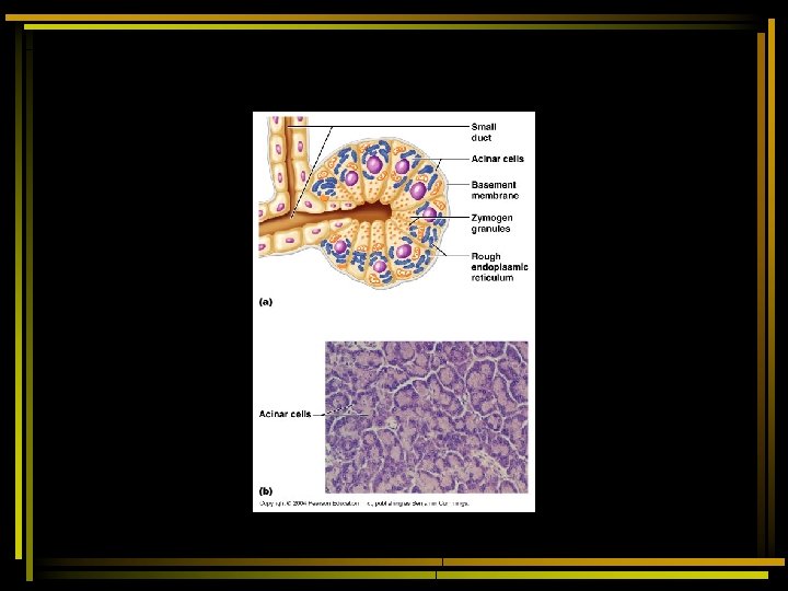 Pancreas: function of exocrine glands. Enzymes released in active or inactive form? (28) • The exocrine (ducts) glands of the pancreas secrete pancreatic juice which breaks down all categories of foodstuff. • Acini – clusters of secretory cells – contain zymogen granules with digestive enzymes • Enzymes are released in inactive form and become active in the duodenum
