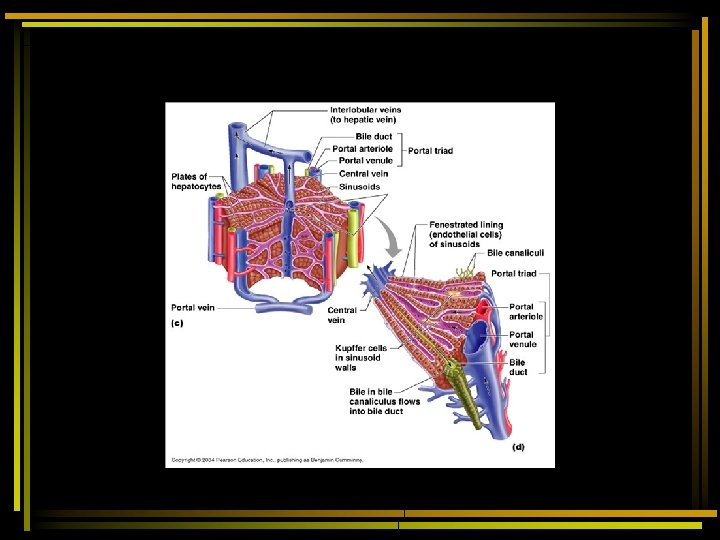 Hepatocytes • • Hepatocytes’ functions include: Production of bile Processing of blood borne nutrients Storage of fat-soluble vitamins (A, D, E) • Detoxification (alcohol, Tylenol)