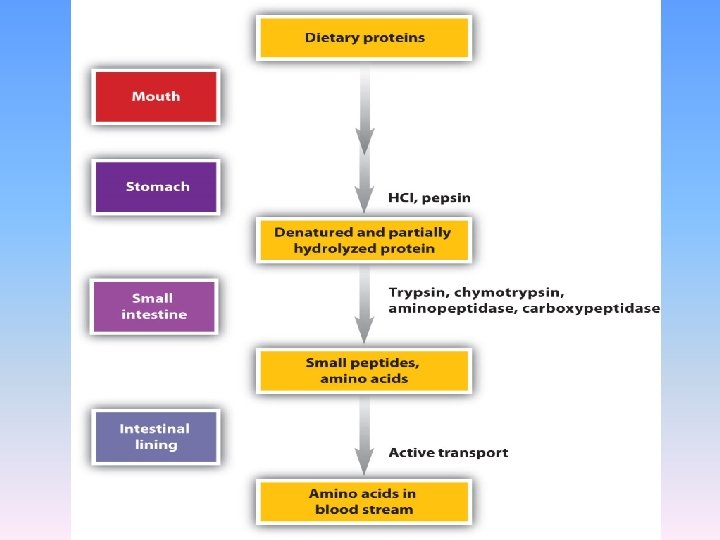 As a result of the action of these enzymes, polypeptide chains are digested into free amino acids, dipeptides, and tripeptides. The free amino acids are absorbed by cotransport with Na+ into the epithelial cells and secreted into blood capillaries. The dipeptides and tripeptides enter epithelial cells by the action of a single membrane carrier. This carrier functions in secondary active transport using a H+ gradient to transport dipeptides and tripeptides into the cell cytoplasm. Within the cytoplasm, the dipeptides and tripeptides are hydrolyzed into free amino acids, which are then secreted into the blood.
