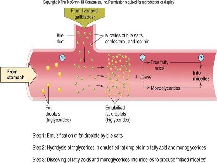 Free fatty acids, monoglycerides, and lysolecithin, which are more polar than the undigested lipids, quickly become associated with micelles of bile salts, lecithin, and cholesterol to form “mixed micelles” These micelles then move to the brush border of the intestinal epithelium where absorption occurs.